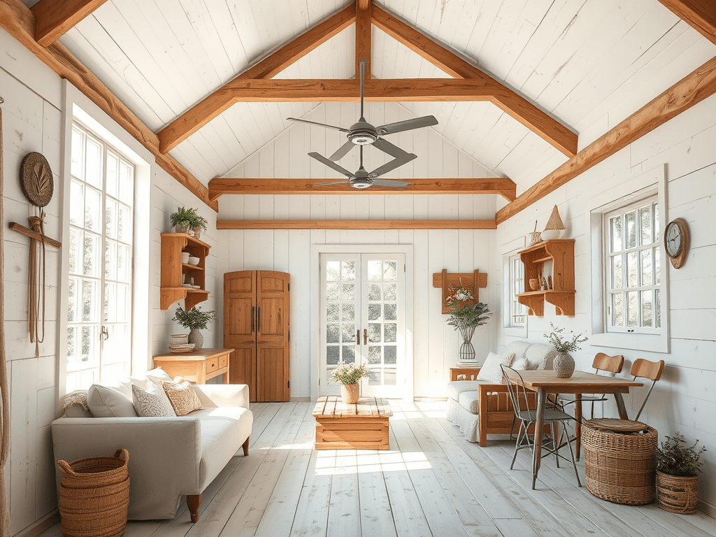 La couleur clé de ce style est le blanc. Il ne faut surtout pas hésiter à en faire usage. Il permet un agencement parfait avec n’importe quel matériau et un bel équilibre avec les quelques éléments bruts intégrés au décor. Pensons notamment au plancher ou aux poutres exposées. Le bois, toujours présent, est plus clair ou grisé sans toutefois perdre son aspect chaleureux. Les autres teintes à favoriser sont celles rappelant la nature, mais plus pâles, plus pastels : bleu ciel, vert sauge ou ivoire.